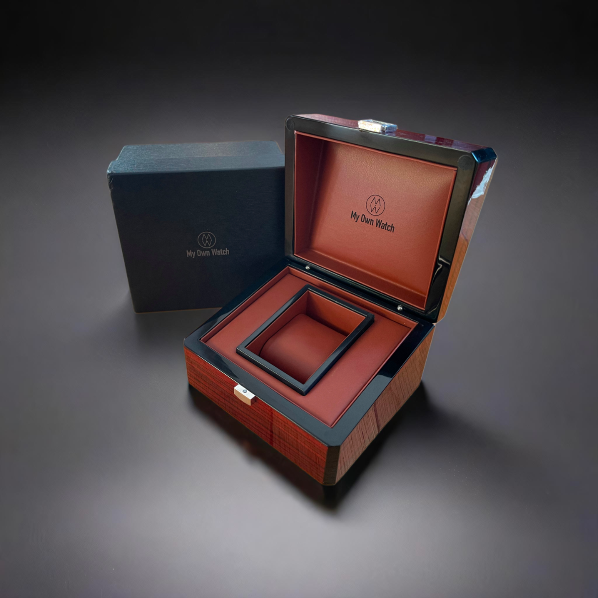 Quand votre montre sort de l’atelier, environ 6 semaines plus tard, nous l’emballons dans un écrin sobre et élégant ou alors dans un écrin en bois de luxe personnalisé à votre nom.