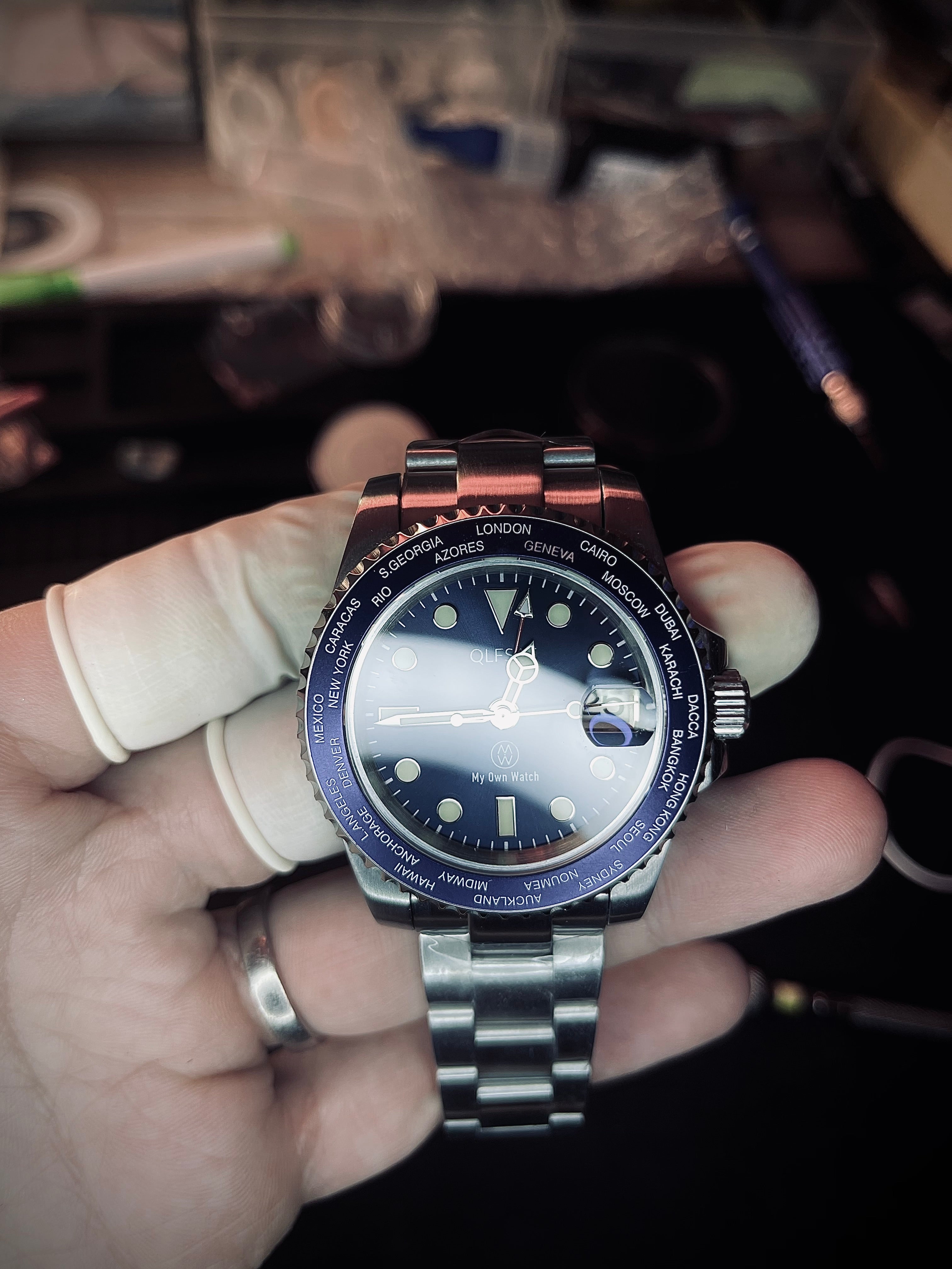 Retournez la montre, et vous découvrirez le mouvement GMT MW-JG01, réglé avec soin, à travers un fond transparent. Sur la masselotte, les initiales des trois amis gravées rappellent que cette montre n’existerait pas sans leur complicité — un clin d’œil discret au lien qui les unit.