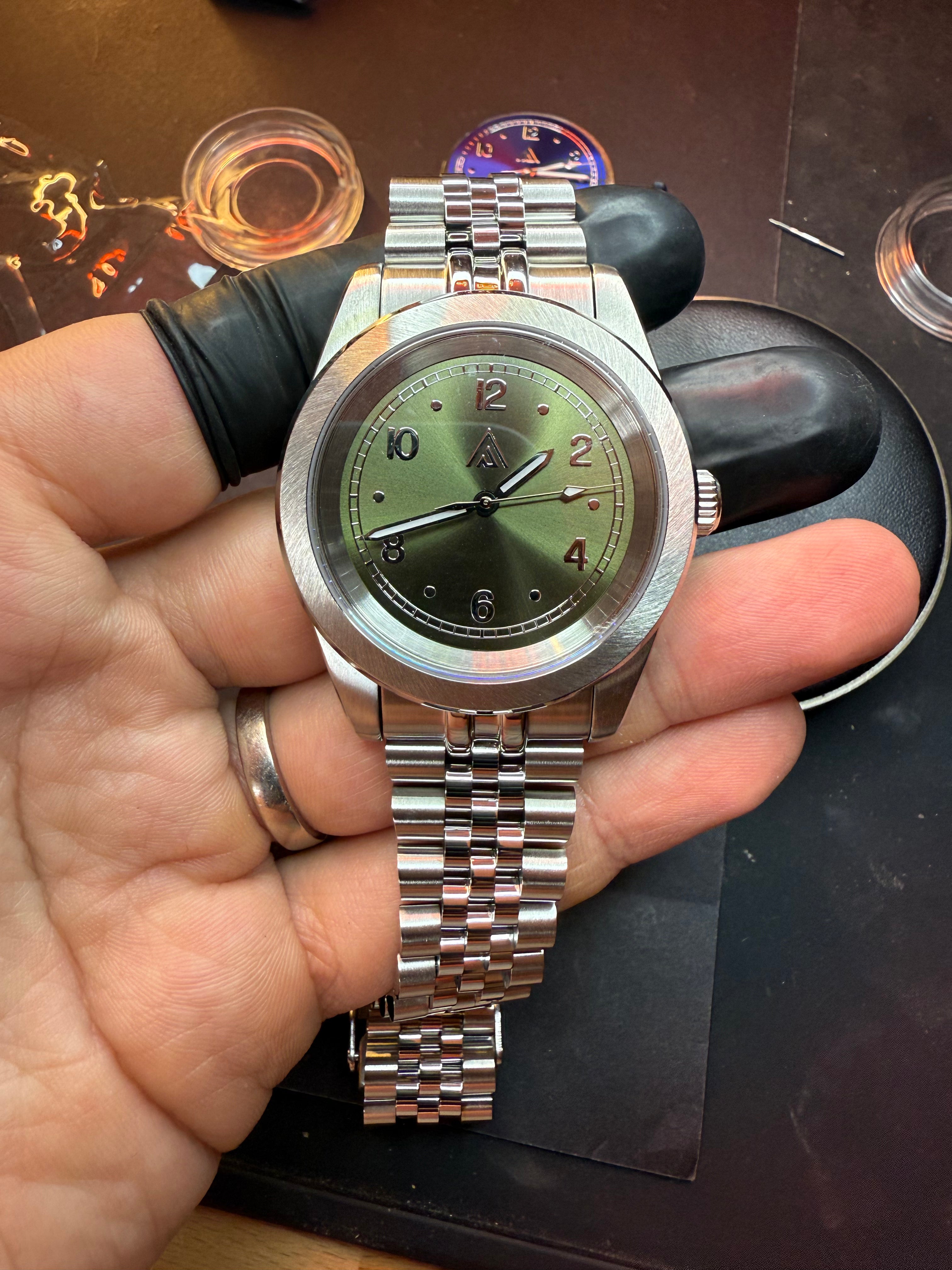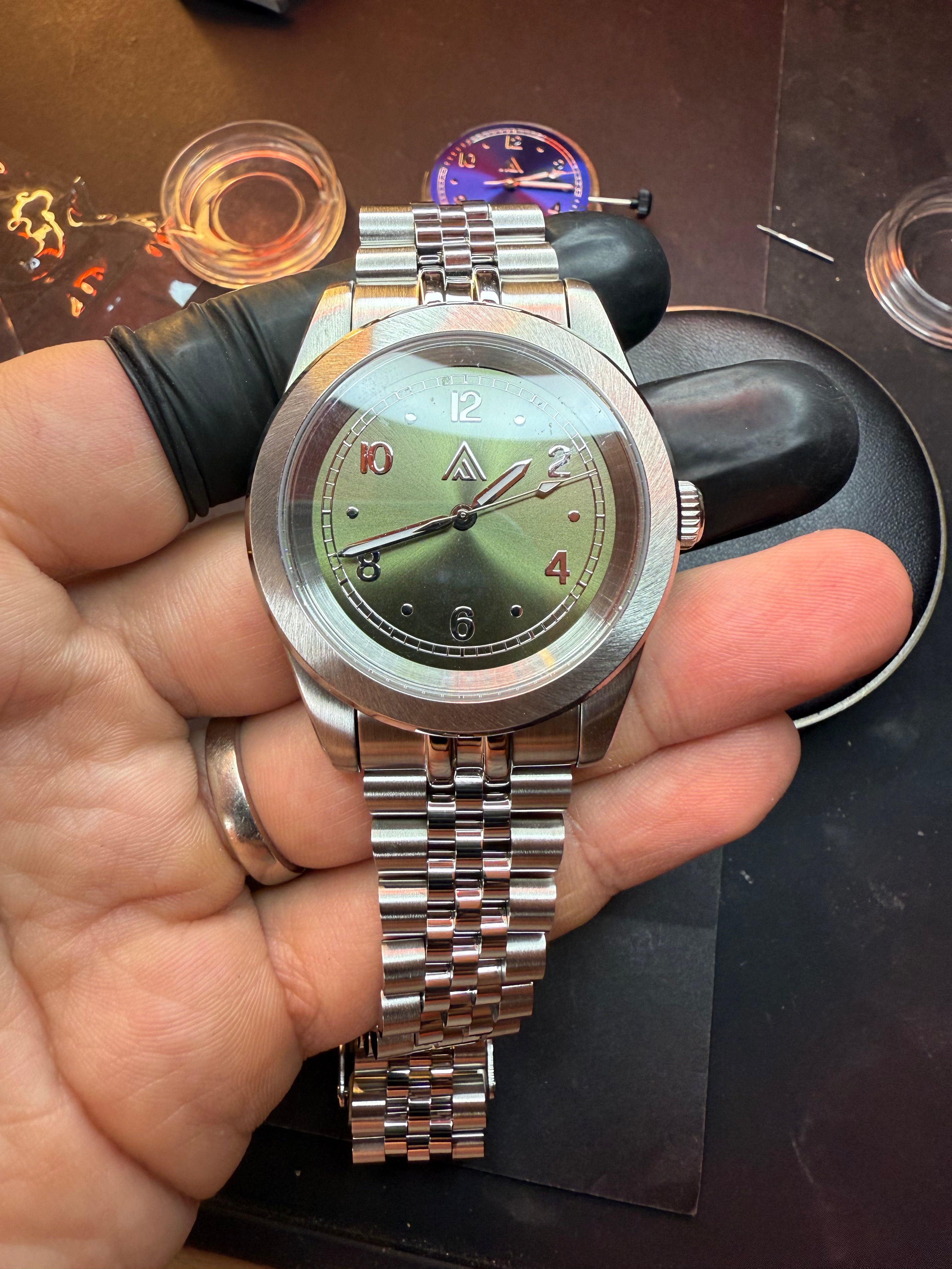 Nos montres sont équipées du mouvement MW-JA01 ou MW-JG01 (GMT), mouvement automatique Japonais modifié, décoré et réglé en interne (-10s/+10s dans les conditions de l'atelier).
